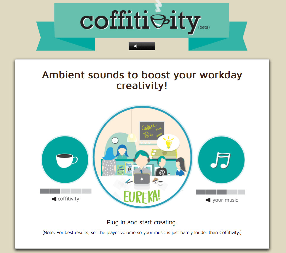 現在,你安坐家中也可以享受身處咖啡店的感覺,卻又不必早早趕到咖啡店佔位子了。近日有一個新網站Coffitivity,可以讓用戶播出模擬咖啡店背景的噪音,足不出戶也能提升工作效率。效果不俗,配上自己心愛的音樂,便是理想的工作環境了,而且你也可以隨時控制聲量,隨心所欲。在街上可就沒有這種可能了。大概,只消在家中添置一部咖啡機,就更完美了‧‧‧‧‧‧